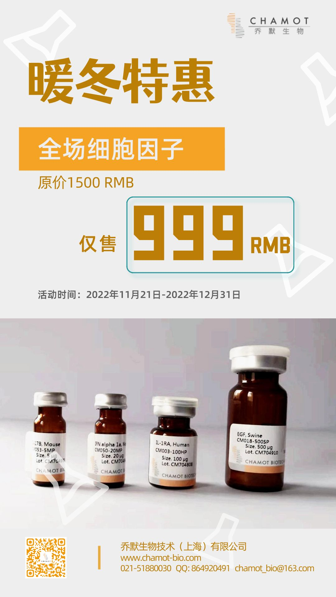 活動內(nèi)容:喬默全線重組細(xì)胞因子,售價1500RMB規(guī)格產(chǎn)品,購買即可享受特惠價999RMB。